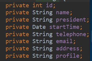 public String toString() {return "College{" +"id=" + id +", name='" + name + '\'' +", president='" + president + '\'' +", startTime=" + startTime +", telephone='" + telephone + '\'' +", email='" + email + '\'' +", address='" + address + '\'' +", profile='" + profile + '\'' +'}';