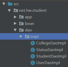 系统有四张表:College、Status、Student与User表,对这四张表的操作就在相应的数据访问接口里进行规定,有四个数据访问接口:CollegeDao、StatusDao、StudentDao与UserDao。注意,这些接口要放到dao子包里。