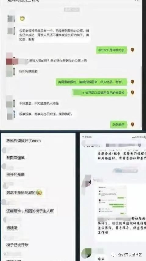 石某上班时,发现自己的椅子不见了,于是在公司群里发问有没有人看见自己的椅子,该同事竟回答:公司创业还未成功,开发人员不能享用这么好的椅子...