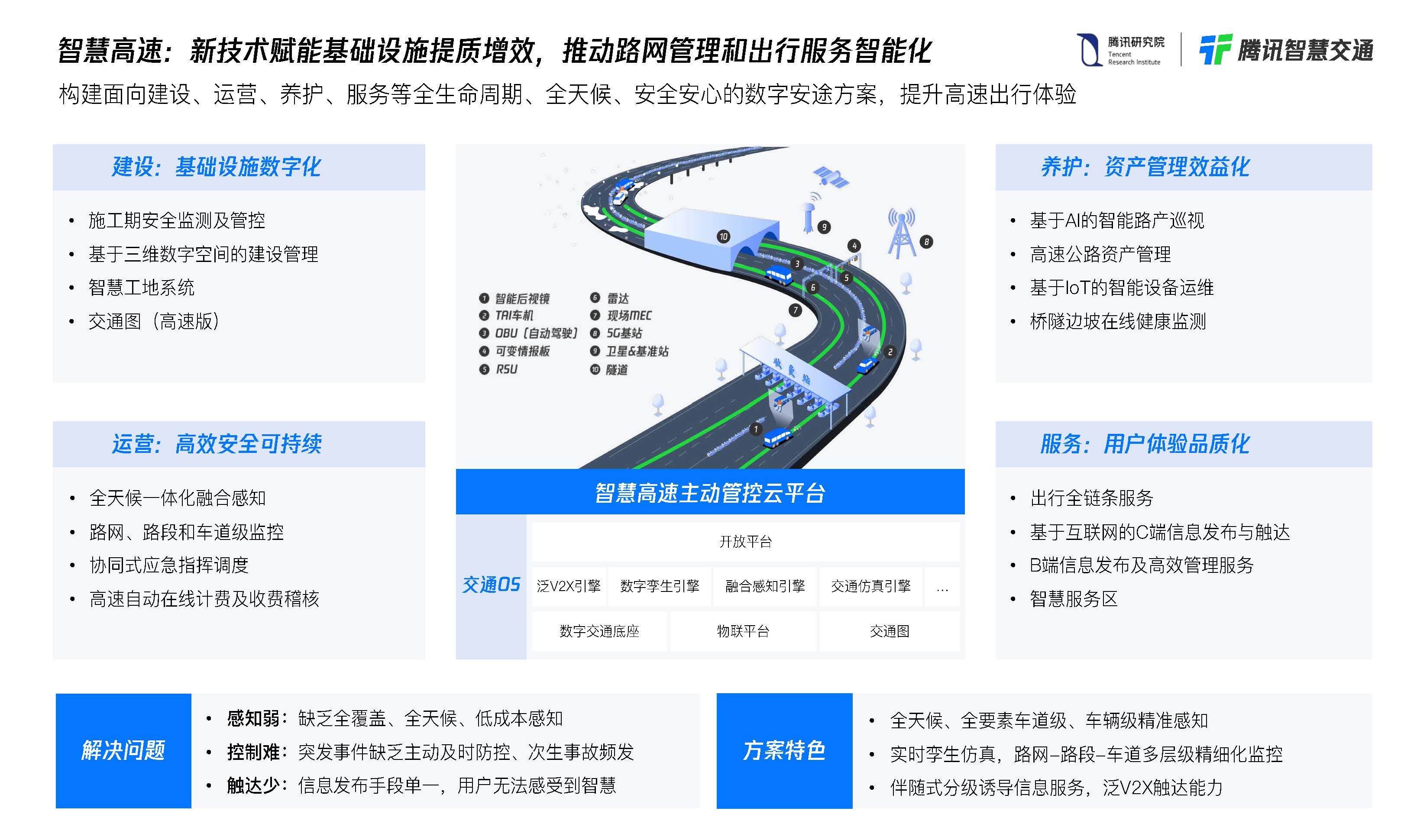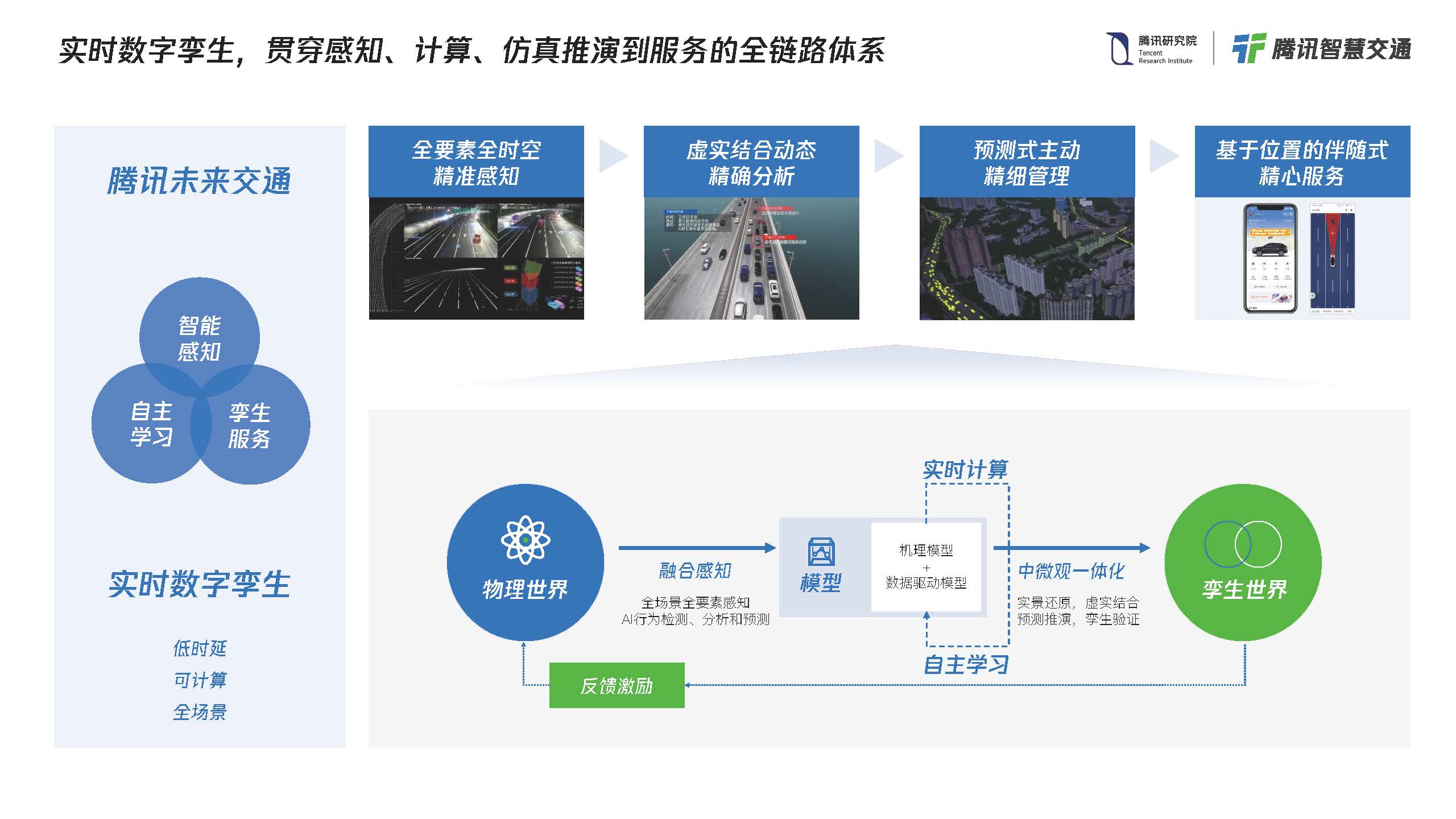 通过连接交通参与者、载运⼯具、基础设施和运⾏环境,实现全天候、全周期、全感知;通过对实时数据的汇聚分析,借助数字孪⽣搭建时空⼀体的计算框架,强化交通的计算能⼒,实现强计算;助⼒交通管理者开展动态实时监测,提升交通运输的决策分析和协同运⾏能⼒,实现慧决策;通过多⽹、多平台和多端,让有效的交通信息按需精准传递到每⼀个⽤户,实现泛触达;系统对服务信息进⾏实时反馈,实现可进化。