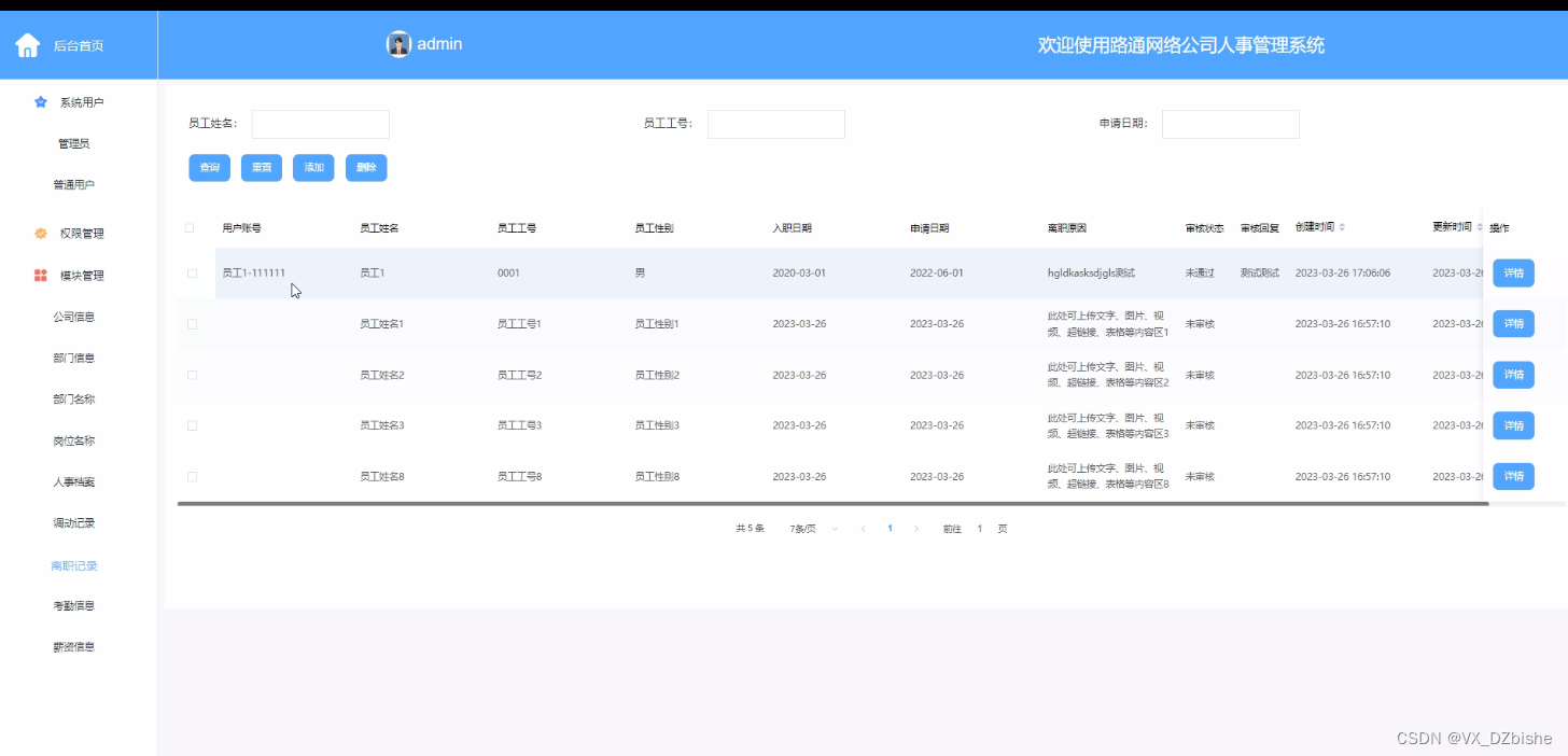 查找离职时,输入需要查找的离职名,调用getData方法获取所有数据并且进行分页,把获取到的所有数据显示到视图上,这时候只需要用脚本方法便能快速查找,不涉及对数据库操作。