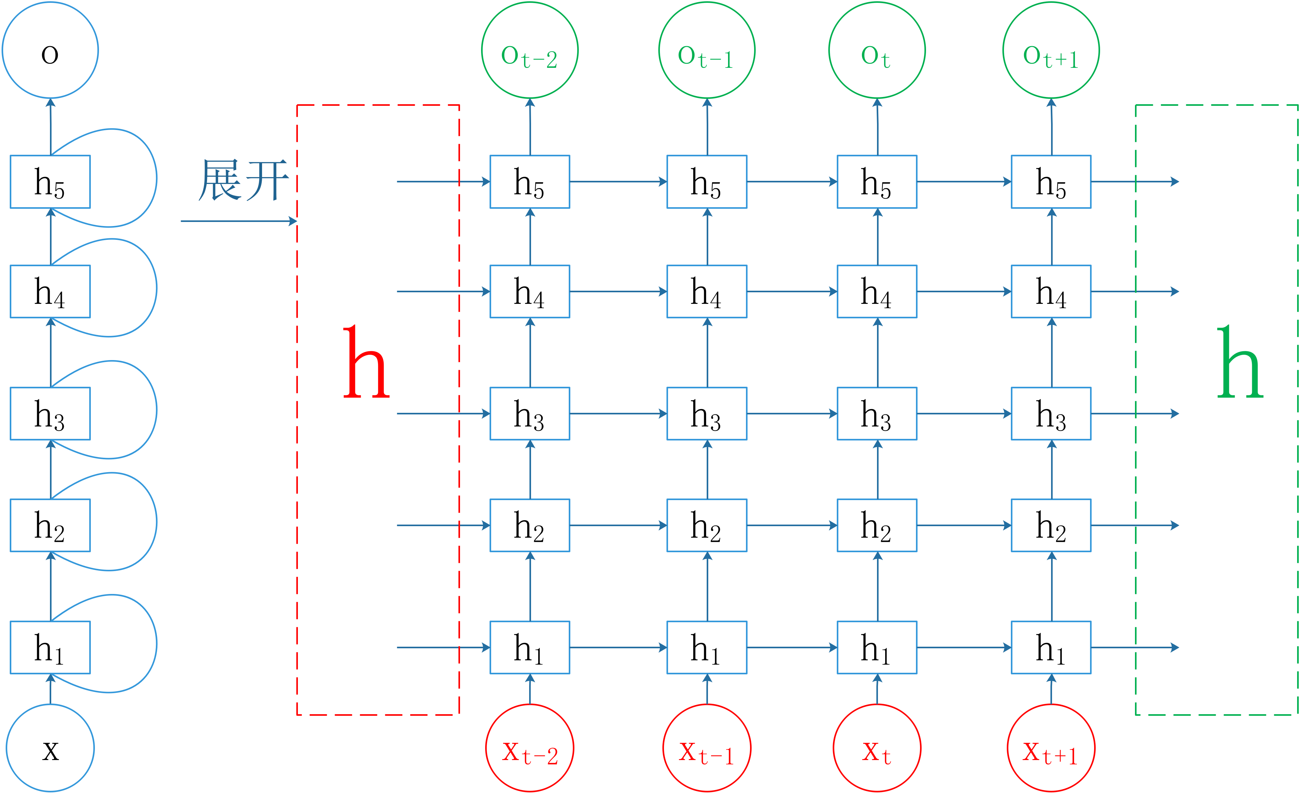 红色部分表示RNN的输入部分,绿色部分表示RNN的输出部分。不难看出来,RNN的输入包含两个部分,除了数据输入 x x x外,我们还要初始化隐藏层状态的输入 h h h,同理,RNN的输出也包含两个部分。