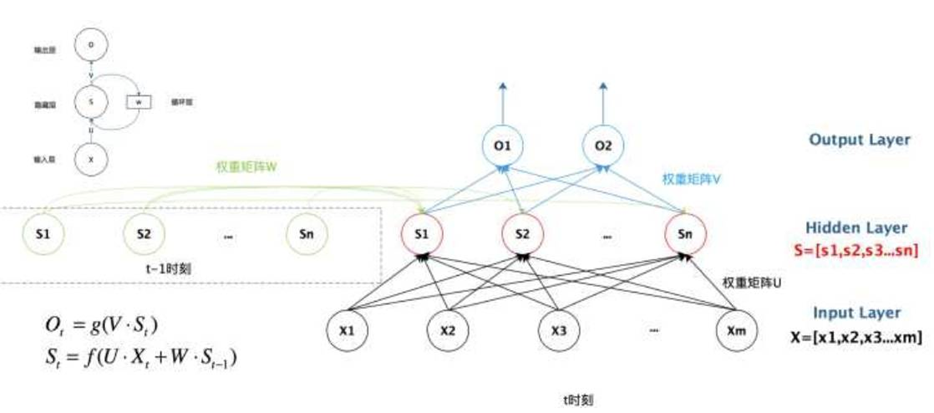 RNN的一个cell往往占据一个隐层,只有一个隐层的RNN其网络结构如下图左,按时间轴展开后就得到了右边的图像。
