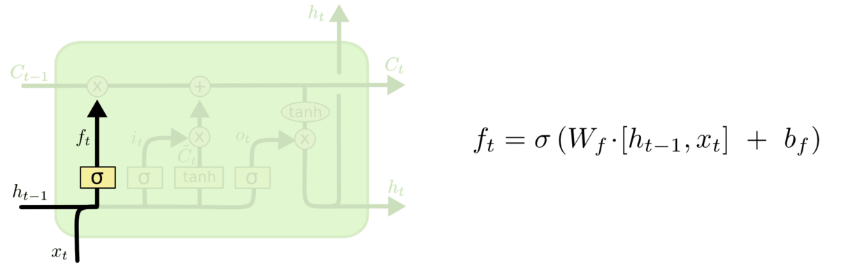 下面给出了LSTM的遗忘门示意图,它根据 h t − 1 h_{t-1} ht−1和 x t x_{t} xt决定忘记细胞状态的哪些值。