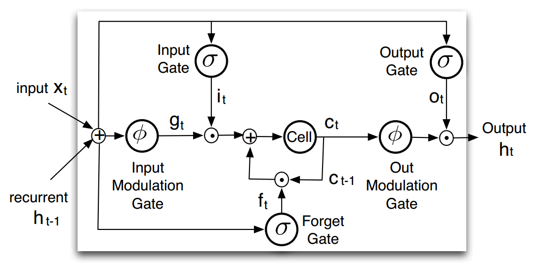 用三种门结构解释LSTM是目前很多blog用的方法,其实LSTM还可以用五种门结构来理解,新加入了输入调制门(input modulation gate)和输出调制门(output modulation gate),结构其实还是一样的,只不过用五门结构解释会更加的具体,见下图: