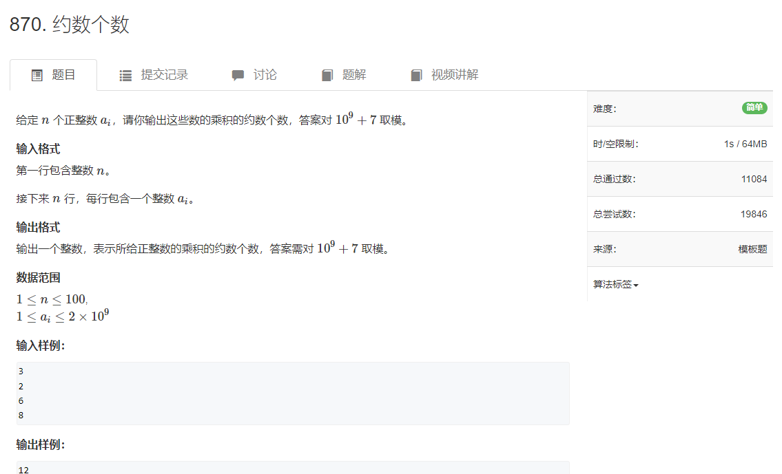 {int n;cin >> n;ll ans = 1;//因为要连乘,所以初始化为1unordered_map hash;while (n--) {int x;cin >> x;for (int i = 2; i <= x / i; i++) {while (x % i == 0) {x /= i;//分解质因数hash[i]++;//质因数的指数++(次数即指数)}}if (x > 1) hash[x]++;//保留最后一个质因数}for (auto &i : hash) ans = ans * (i.second + 1) % mod;//约数公式cout << ans;return 0;