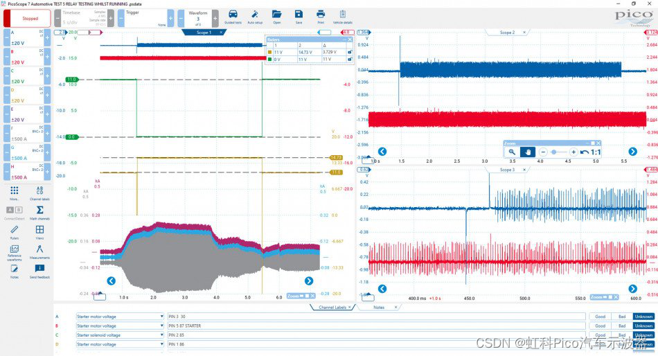 这个启动机运作使用启动继电器就像传统的车辆。一个讯号被送到继电器的接地引脚(第85脚),这使第85.86脚位产生电压差从而造成电流流动。这个电流在线圈产生了磁场来使接触器接合在一起。接触器被连接到第87脚和30脚,87脚是正电供应脚,第30脚是被连接到启动机的电磁开关。当发动机有重新启动的需求时我们应该看到第85.86脚改变来切换电磁开关接合启动机。使用8通道的示波器,我们也可以决定捕捉电机上的三相电来看电机需要协助启动发动机的时机点。