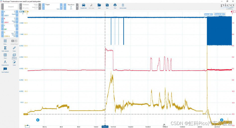 我们很快地开始意识到,每次车辆在电力模式下试图重新启动发动机时,都会跳出故障。为了捕获发生的事情,我们决定连接Pico示波器到曲轴、油门踏板传感器和驱动车辆的高压电流。