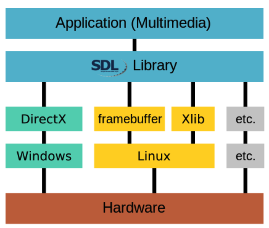 SDL (Simple DirectMedia Layer)是一套开源代码的跨平台多媒体开发库,使用C语言写成。SDL提供了数种控制图像、声音、输出入的函数,让开发者只要用相同或是相似的代码就可以开发出跨多个平台(Linux、Windows、Mac OS等)的应用软件。目前 SDL 多用于开发游戏、模拟器、媒体播放器等多媒体应用领域。用下面这张图可以很明确地说明 SDL 的用途。