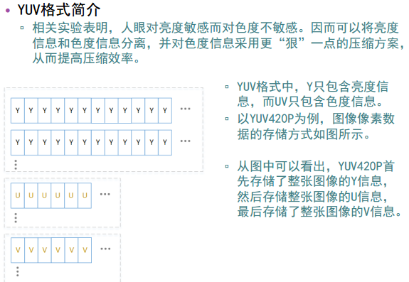 常见的像素数据格式有RGB24, RGB32, YUV420P, YUV422P,YUV444P等。压缩编码中一般使用的是YUV格式的像素数据, 最为常见的格式为YUV420P。