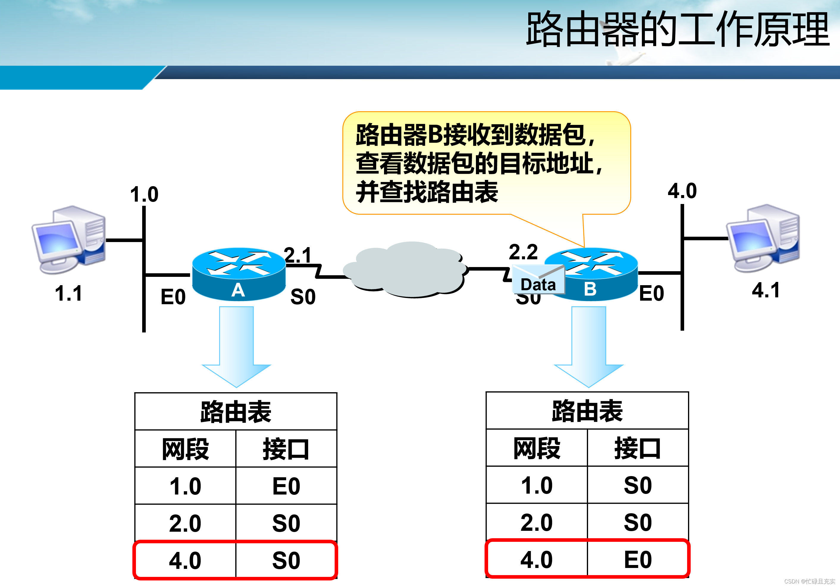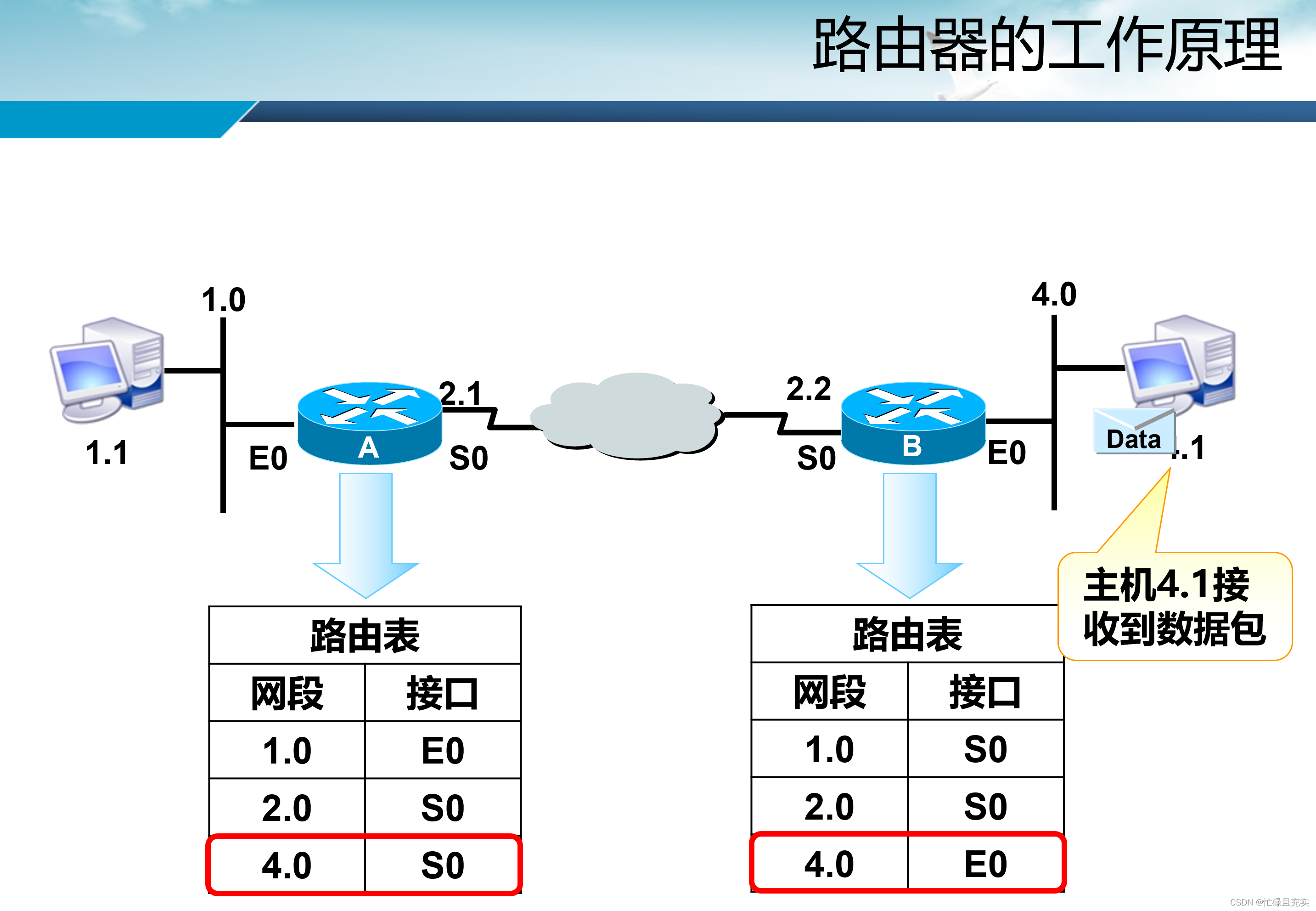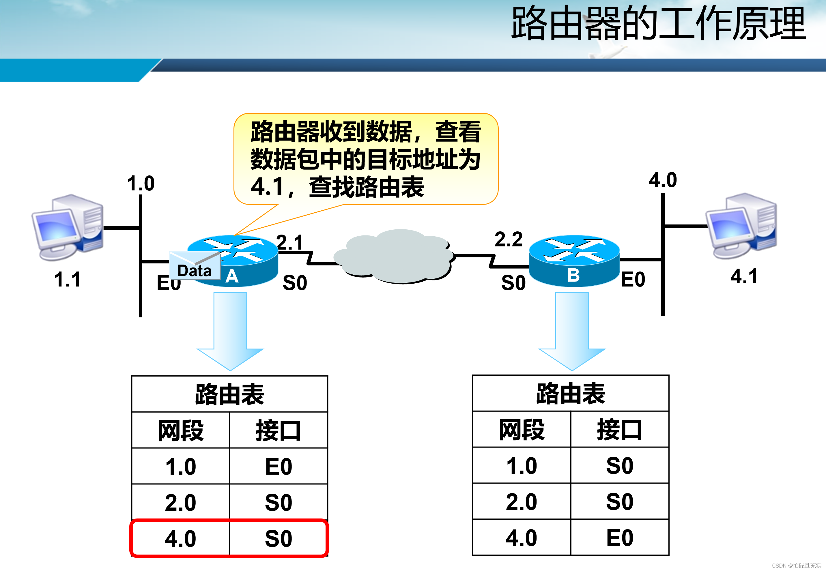 中间可能不止一个路由器,数据转发到路由器B,路由器B进行与A相同的工作,路由器进行解包,查看到数据包中的目标地址为4.1,然后查找路由表,在理由表内查询到4网段所在的接口(E0),将数据转发到E0口。