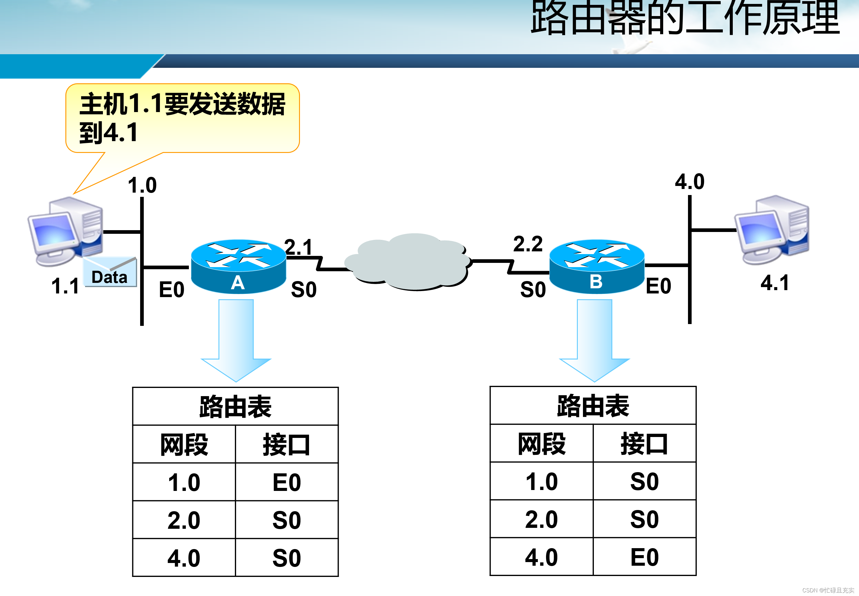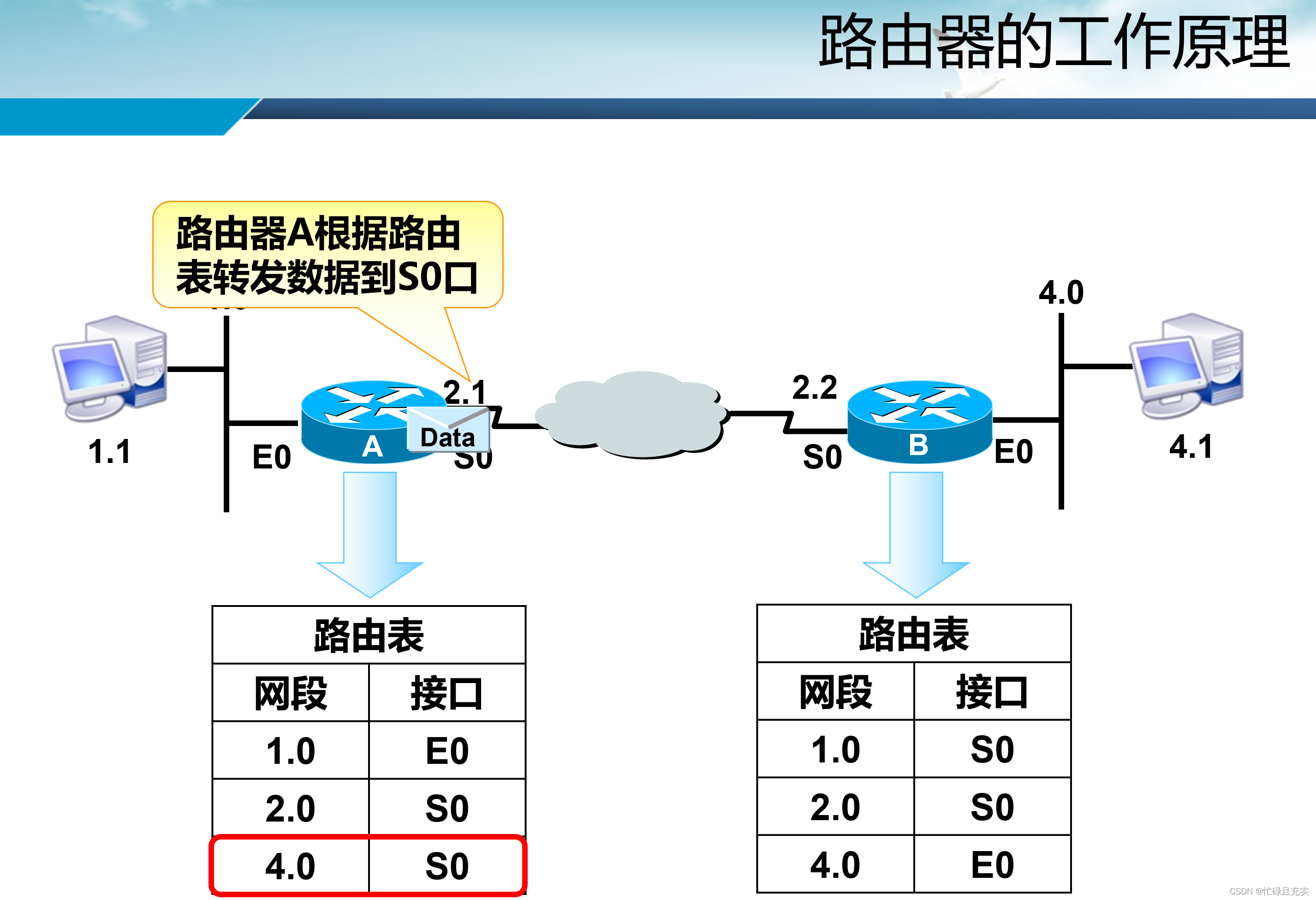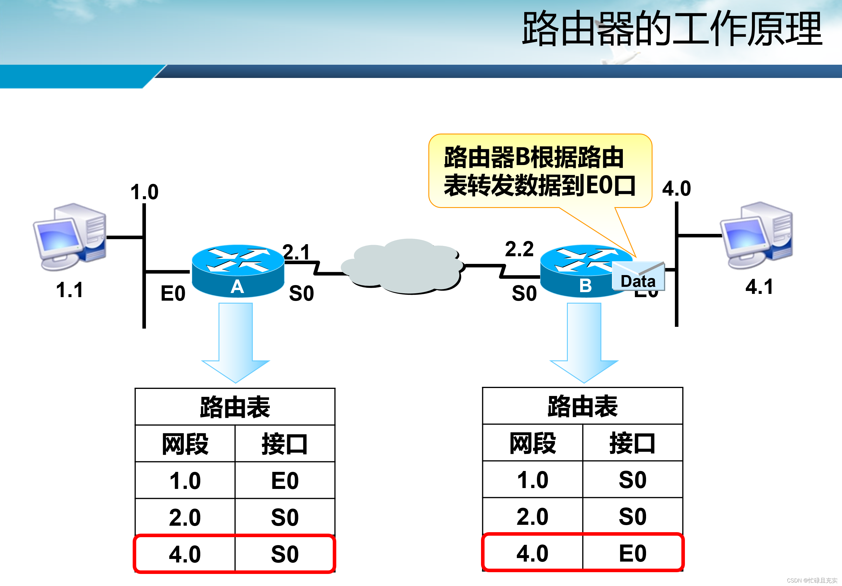 中间可能不止一个路由器,数据转发到路由器B,路由器B进行与A相同的工作,路由器进行解包,查看到数据包中的目标地址为4.1,然后查找路由表,在理由表内查询到4网段所在的接口(E0),将数据转发到E0口。