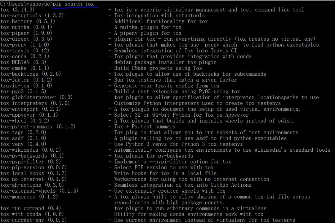 使用pip search tox ,可以看到数量众多的“tox-”开头的库,它们都是 tox 的插件包。其中不乏 setuptools、pipenv、conda、travis、pytest、docker 等被大家熟知的名字。