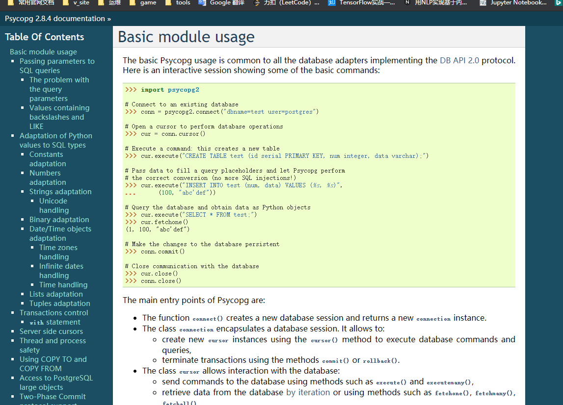在这个操作文档网站中,使用的思路已经很清楚的写出来了 http://initd.org/psycopg/docs/usage.html