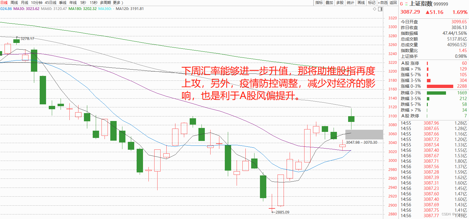 若下周汇率能够进一步升值,那将助推股指再度上攻,另外,疫情防控调整,减少对经济的影响,也是利于A股风偏提升。