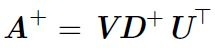 其中,矩阵U,D 和V 是矩阵A奇异值分解后得到的矩阵。对角矩阵D 的伪逆D+ 是其非零元素取倒之后再转置得到的。