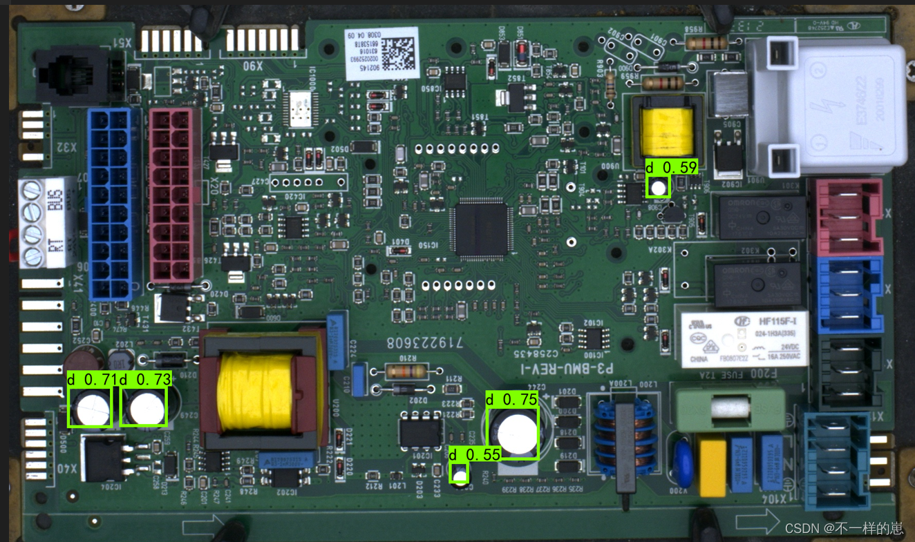 训练采用5000张电路板, 每张电路板上标记了4-30个的电容,4个种类(上,下,左, 右),检测电容极性,检测效果如下