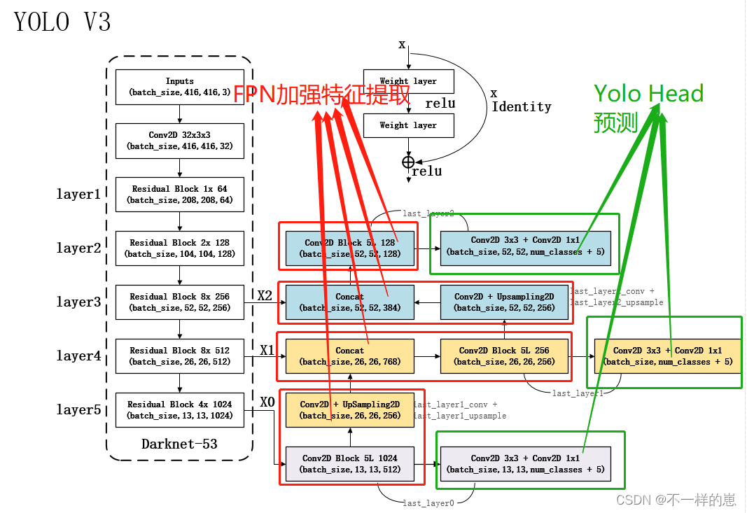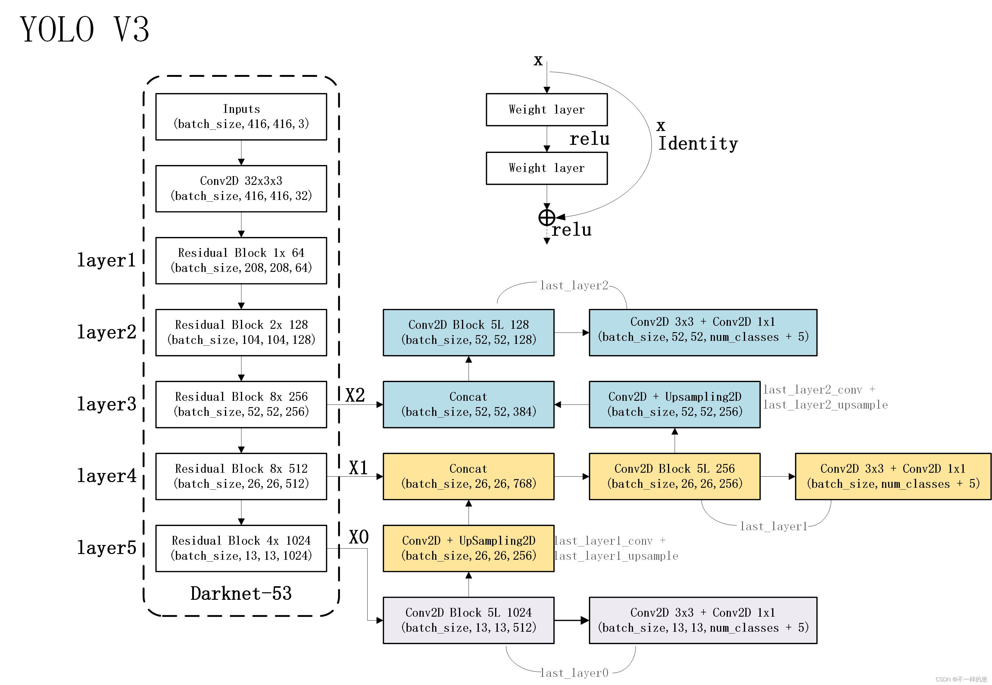 def make_five_conv(x, num_filters, weight_decay=5e-4):x = DarknetConv2D_BN_Leaky(num_filters, (1,1), weight_decay=weight_decay)(x)x = DarknetConv2D_BN_Leaky(num_filters*2, (3,3), weight_decay=weight_decay)(x)x = DarknetConv2D_BN_Leaky(num_filters, (1,1), weight_decay=weight_decay)(x)x = DarknetConv2D_BN_Leaky(num_filters*2, (3,3), weight_decay=weight_decay)(x)x = DarknetConv2D_BN_Leaky(num_filters, (1,1), weight_decay=weight_decay)(x)return xdef make_yolo_head(x, num_filters, out_filters, weight_decay=5e-4):y = DarknetConv2D_BN_Leaky(num_filters*2, (3,3), weight_decay=weight_decay)(x)# 255->3, 85->3, 4 + 1 + 80y = DarknetConv2D(out_filters, (1,1), weight_decay=weight_decay)(y)return y#---------------------------------------------------#