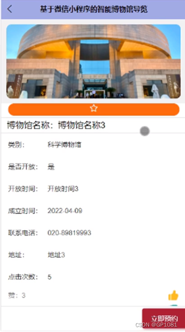 博物馆推荐,在博物馆推荐页面可以查看博物馆名称,类别,是否开放,开放时间,成立时间,联系电话,地址,点击次数等信息,用户可进行预约等操作;如图5-3所示。