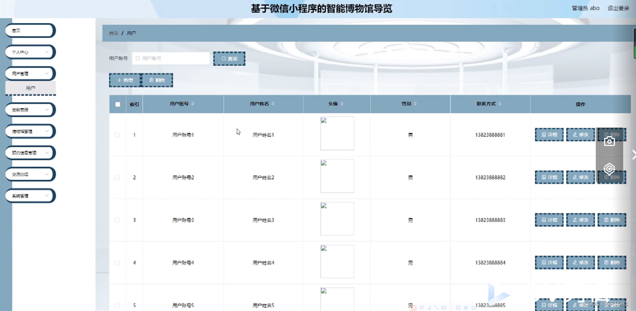 用户管理,在用户管理页面可以对索引,用户账号,用户姓名,头像,性别,里联系方式等内容进行详情、修改或删除等操作,如图5-7所示。
