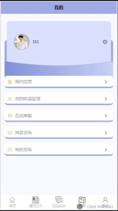 用户,用户在我的页面可以对预约信息,我的收藏管理,在线客服,我要发帖,我的发帖等详细信息进行操作,如图5-4所示。