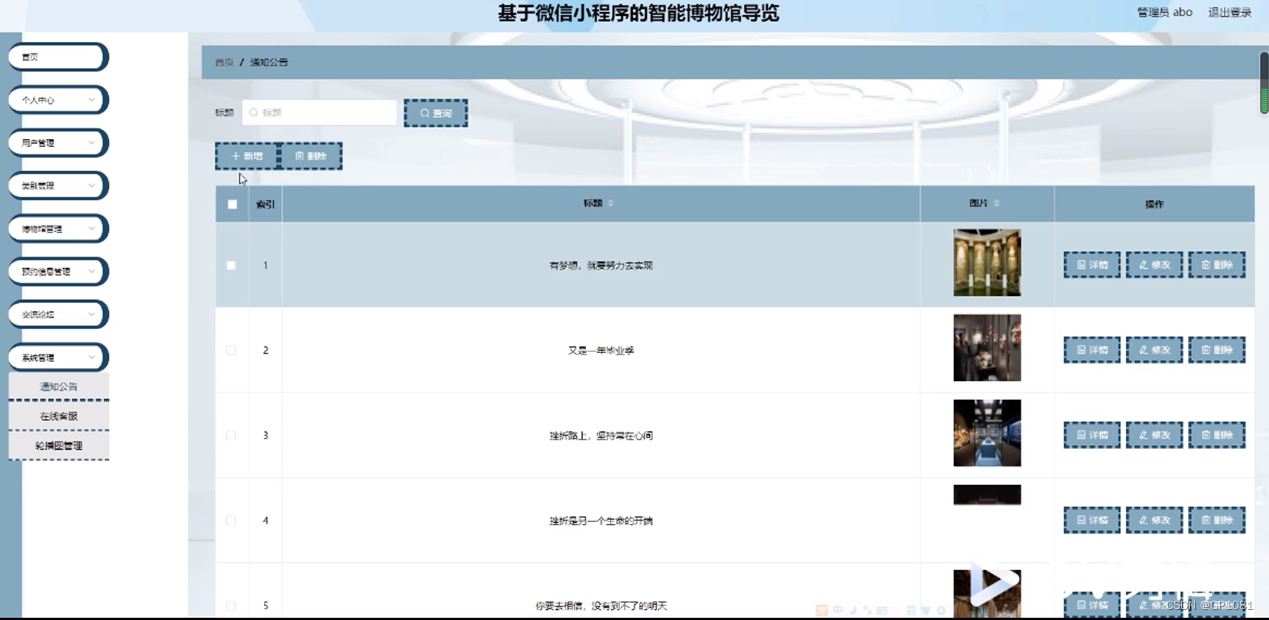 系统管理,在通知公告页面可以对索引,标题,图片等内容进行详情,修改或删除等操作,还可以对在线客服,轮播图管理等内容进行详细操作;如图5-12所示。
