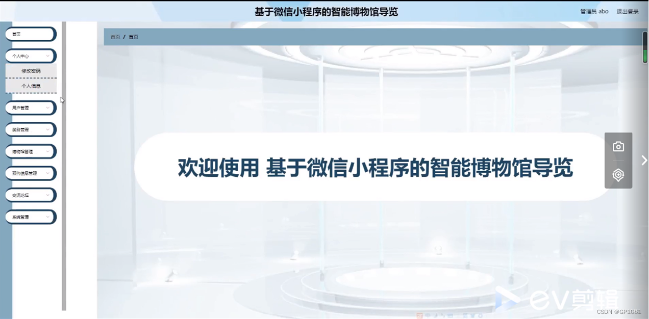 4、主页内容管理:管理员登录以后,可以对首页,个人中心,用户管理,类别管理,博物馆管理,预约信息管理,交流论坛,系统管理进行详细操作。