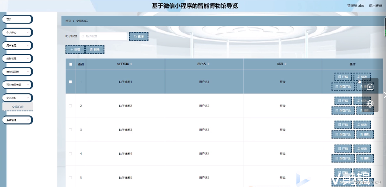 交流论坛,在交流论坛页面可以对索引,帖子标题,用户名,状态等内容进行详情,修改,查看评论和删除等操作,如图5-11所示。