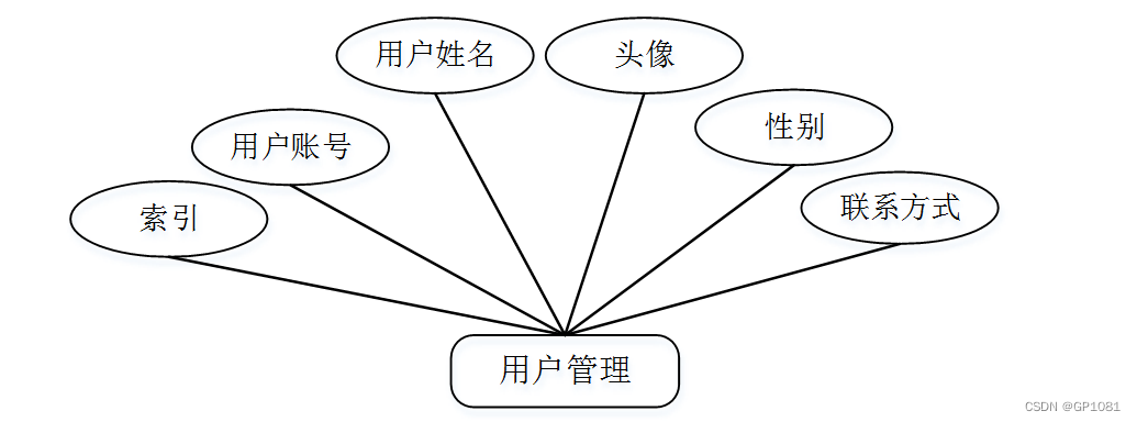 用户管理实体包括索引,用户账号,用户姓名,头像,性别,联系方式等属性。用户管理实体图如图4-2所示: