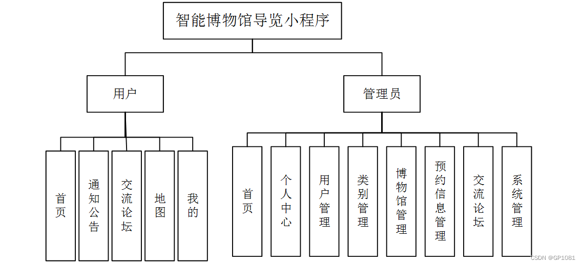 智能博物馆导览小程序主要有两大模块。分别是小程序模块(用户),后台模块(管理员);详细规划如图4-1所示。