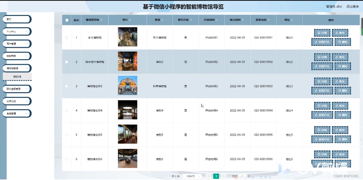博物馆管理,在博物馆管理页面可以对索引,博物馆名称,图片,类别,是否开放,开放时间,成立时间,联系电话,地址等内容进行详情,修改,查看评论和删除等操作,如图5-9所示。