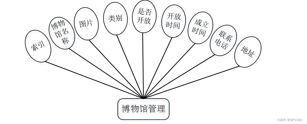 博物馆管理实体包括索引,博物馆名称,图片,类别,是否开放,开放时间,成立时间,联系电话,地址等属性;博物馆管理实体图如图4-3所示: