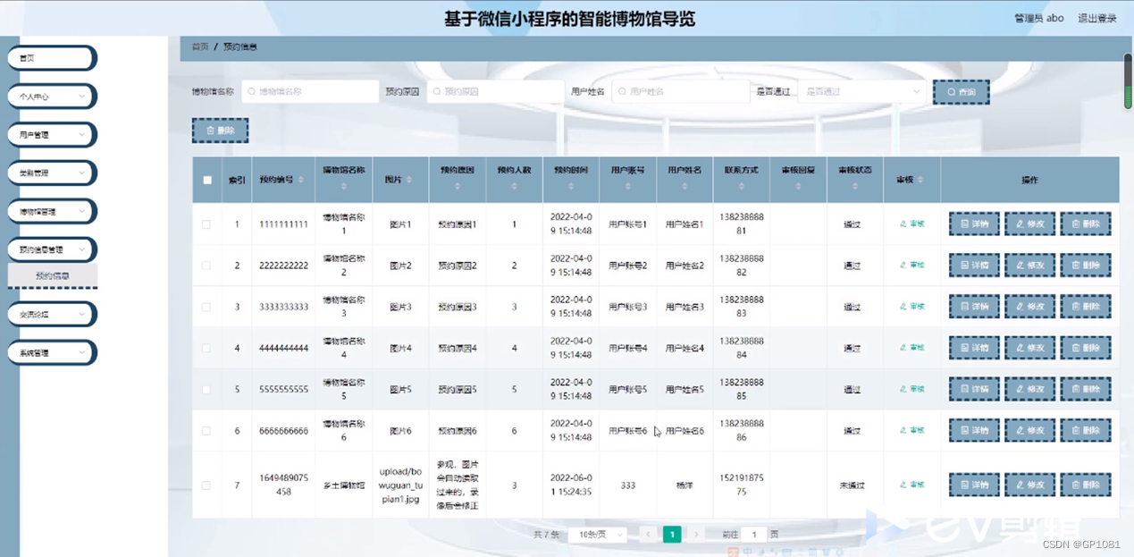预约信息管理,在预约信息管理页面可以对索引,预约编号,博物馆名称,图片,预约原因,预约人数,预约时间,用户账号,用户姓名,联系方式,审核回复,审核状态,审核等内容进行详情,修改或删除等操作,如图5-10所示。