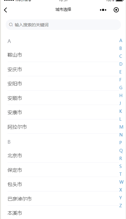 const app = getApp();Page({data: {city: '',cityData: {},_py: ["A", "B", "C", "D", "E", "F", "G", "H", "J", "K", "L", "M", "N", "P", "Q", "R", "S", "T", "W", "X", "Y", "Z"],//搜索列表inputVal: '',hidden: true,showPy: '★',selectData: []},onLoad: function() {var that = this;api.get(app.globalData.cities).then(res => {if(res){that.setData({cityData: res});}})},//选择城市selectCity: function(e) {var dataset = e.currentTarget.dataset;api.post(app.globalData.recruitmentInfo, dataset.fullname).then(res => {wx.setStorageSync('localCity', dataset.fullname)wx.navigateBack({delta: 1,})})},//获取文字信息getPy: function(e) {this.setData({hidden: false,showPy: e.target.id,})},setPy: function(e) {this.setData({hidden: true,scrollTopId: this.data.showPy})},//触发全部开始选择tStart: function() {this.setData({hidden: false})},//触发结束选择tEnd: function() {this.setData({hidden: true,scrollTopId: this.data.showPy})},//输入input: function(e) {let cityData = this.data.cityData;let selectData = [];if (e.detail.value == '') {this.setData({inputVal: e.detail.value,selectData});} else {for (let i in cityData) {for (let j in cityData[i]) {if (cityData[i][j].fullName.includes(e.detail.value)) {selectData.push(cityData[i][j].fullName)}}}console.error(selectData);this.setData({selectData,inputVal: e.detail.value,});}},})