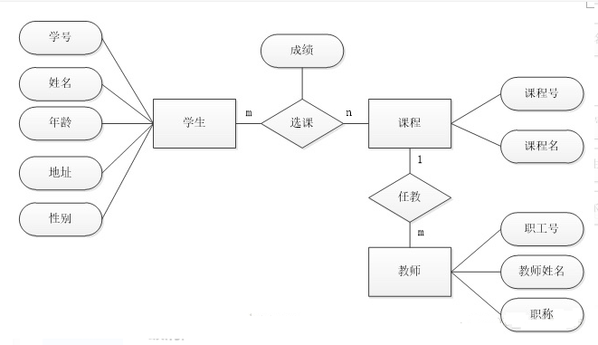 “学生”有属性:学号、姓名、地址、年龄、性别。“教师”有属性:职工号、教师姓名、职称,“课程”有属性:课程号、课程名。