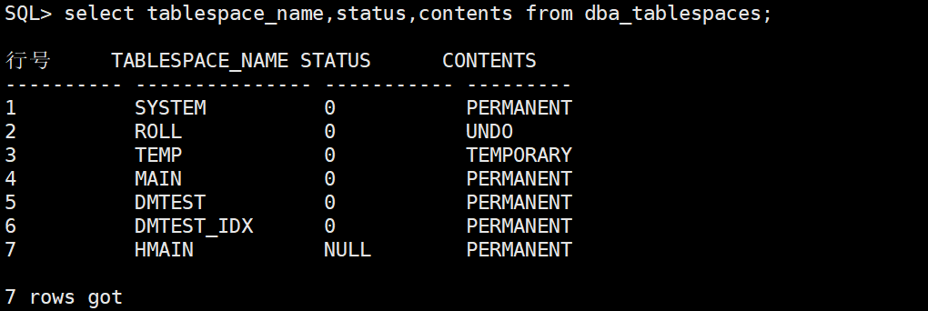 7 HMAIN NULL PERMANENT7 rows got已用时间: 1.012(毫秒). 执行号:911.