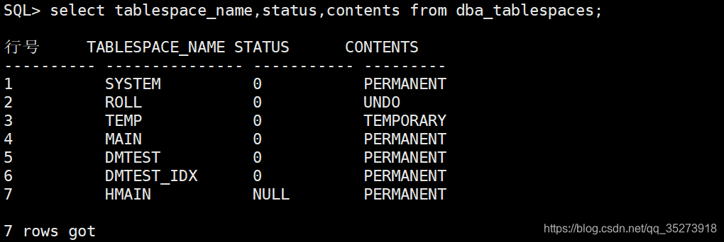 a.查看表空间类型和状态(STATUS为0时是联机状态,为1时是脱机状态)