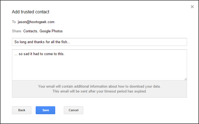 这样,您可以确保家人可以使用存储在“ Google相册”中的家庭照片之类的东西,您的配偶可以完全访问您的联系人以管理您的业务,或者希望与之共享帐户的任何人您的灭亡或丧失能力可以合法地使用它,而无需像您一样伪装自己。