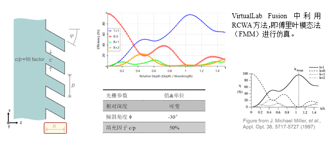 从文献中选择了不同的倾斜光栅几何形状,具有不同的倾斜角、填充因子和调制深度,并且使用傅立叶模态法(FMM)计算衍射效率。