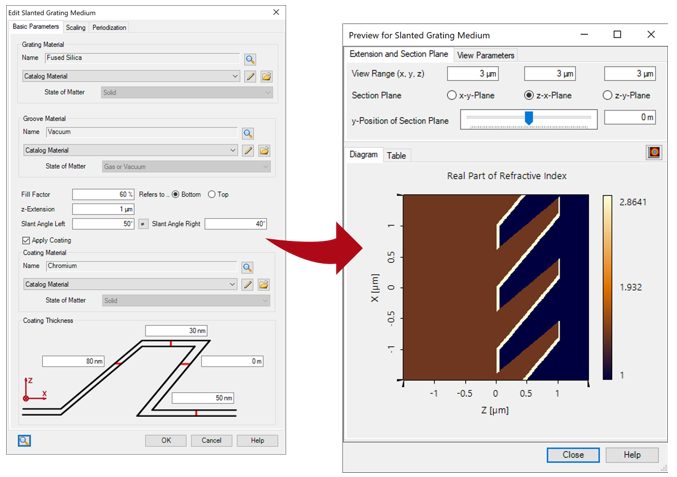 可在VirtualLab Fusion中轻松配置带涂层的倾斜光栅。该用例说明了用于自定义倾斜光栅的可用选项。