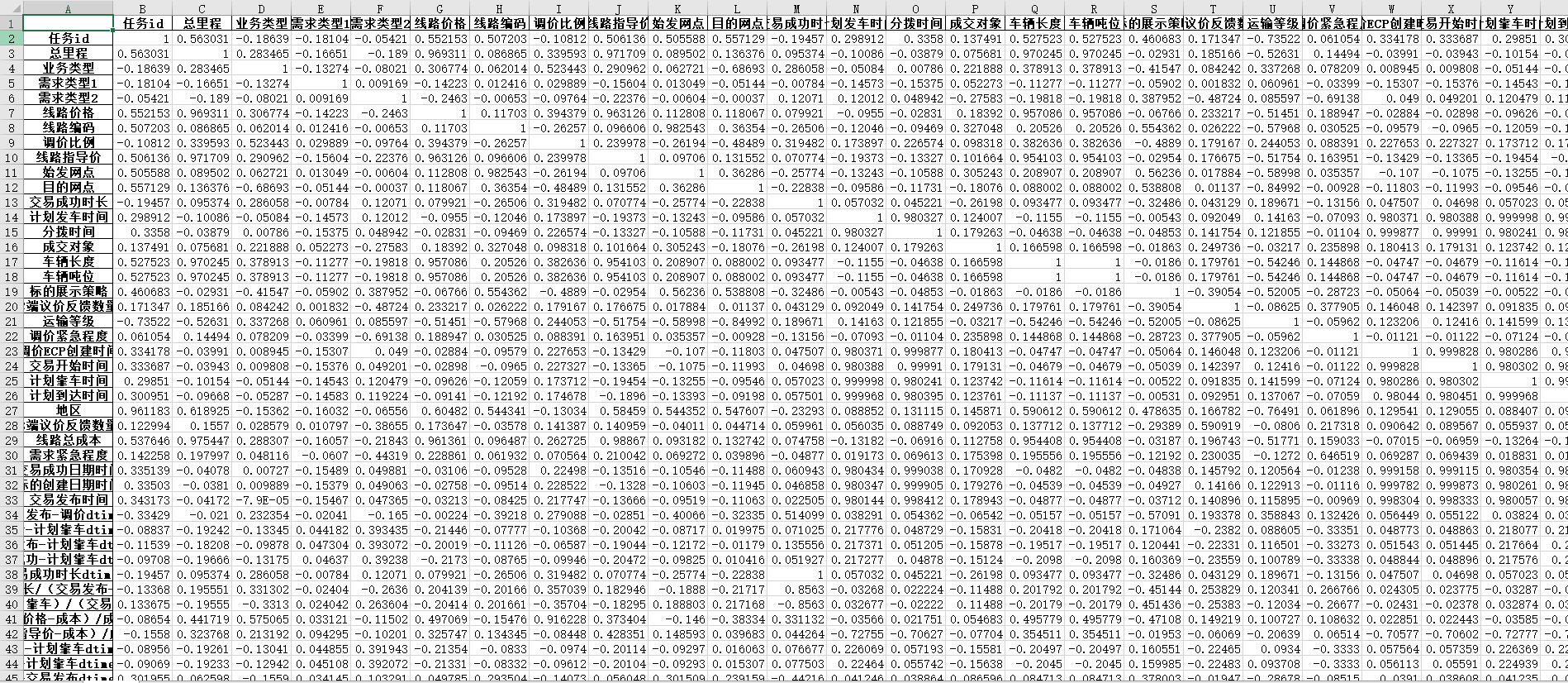(1) 数据的清洗:缺失值处理,即表中一些指标的数据存在“N”值的,需要进行剔除,例如调价紧急程度、C 端议价等;重复值处理,我们认为指标意义相近的可以只择其一作进一步处理,例如交易成功时长和交易开始时间与交易成功时
