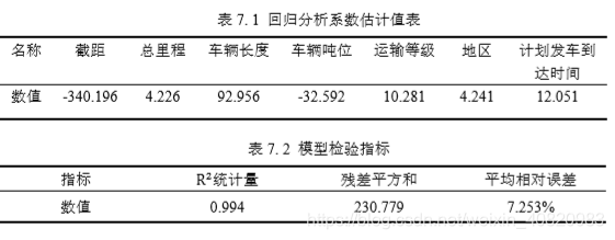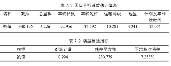 根据筛选后的指标建立多元线性回归模型,并使用 Python 进行计算,得到总里程、车辆长度、车辆吨位、运输等级、地区、计划发车计划到达时间的回归分析系数的估计值: