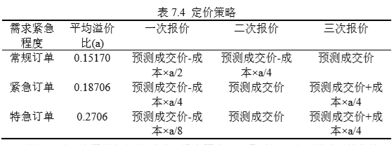 对于调价策略,因为不同紧急程度的订单显然调价策略应该有所区别,对于常规订单,应以提高平台利润为目标;对于紧急订单,时间相比于特急订单次重要,但价格尽量应合理;对于特急订单,应该提高价格让任务尽快被完成。通过上述分析,整理调价策略如表 7.3 所示: