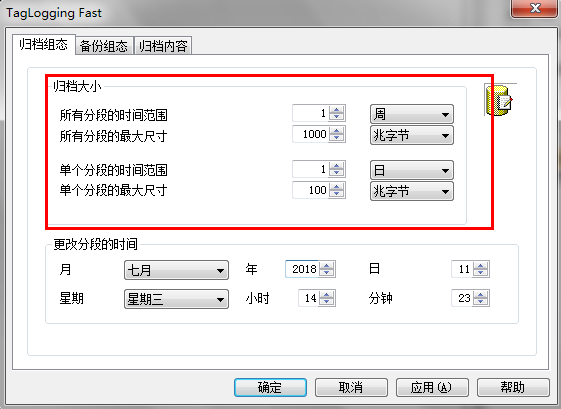 这个设置定义了归档数据库的大小。如果超出其中一个标准,则启动新的分段并删除最旧的分段。