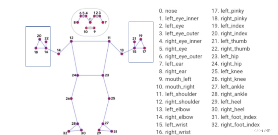 import onnxruntime as ortclass poseDetector():def __init__(self, mode=False, upBody=False, smooth=True, detectionCon=0.5, trackCon=0.5):self.mode = modeself.upBody = upBodyself.smooth = smoothself.detectionCon = detectionConself.trackCon = trackConself.mpDraw = mp.solutions.drawing_utilsself.mpPose = mp.solutions.poseself.pose = self.mpPose.Pose(self.mode, self.upBody, self.smooth, False, True, # 这里的False 和True为默认self.detectionCon, self.trackCon) # pose对象 1、是否检测静态图片,2、姿态模型的复杂度,3、结果看起来平滑(用于video有效),4、是否分割,5、减少抖动,6、检测阈值,7、跟踪阈值'''STATIC_IMAGE_MODE:如果设置为 false,该解决方案会将输入图像视为视频流。它将尝试在第一张图像中检测最突出的人,并在成功检测后进一步定位姿势地标。在随后的图像中,它只是简单地跟踪那些地标,而不会调用另一个检测,直到它失去跟踪,以减少计算和延迟。如果设置为 true,则人员检测会运行每个输入图像,非常适合处理一批静态的、可能不相关的图像。默认为false。MODEL_COMPLEXITY:姿势地标模型的复杂度:0、1 或 2。地标准确度和推理延迟通常随着模型复杂度的增加而增加。默认为 1。SMOOTH_LANDMARKS:如果设置为true,解决方案过滤不同的输入图像上的姿势地标以减少抖动,但如果static_image_mode也设置为true则忽略。默认为true。UPPER_BODY_ONLY:是要追踪33个地标的全部姿势地标还是只有25个上半身的姿势地标。ENABLE_SEGMENTATION:如果设置为 true,除了姿势地标之外,该解决方案还会生成分割掩码。默认为false。SMOOTH_SEGMENTATION:如果设置为true,解决方案过滤不同的输入图像上的分割掩码以减少抖动,但如果 enable_segmentation设置为false或者static_image_mode设置为true则忽略。默认为true。MIN_DETECTION_CONFIDENCE:来自人员检测模型的最小置信值 ([0.0, 1.0]),用于将检测视为成功。默认为 0.5。MIN_TRACKING_CONFIDENCE:来自地标跟踪模型的最小置信值 ([0.0, 1.0]),用于将被视为成功跟踪的姿势地标,否则将在下一个输入图像上自动调用人物检测。将其设置为更高的值可以提高解决方案的稳健性,但代价是更高的延迟。如果 static_image_mode 为 true,则忽略,人员检测在每个图像上运行。默认为 0.5。'''def findPose(self, img, draw=True):imgRGB = cv2.cvtColor(img, cv2.COLOR_BGR2RGB) # 将BGR格式转换成灰度图片self.results = self.pose.process(imgRGB) # 处理 RGB 图像并返回检测到的最突出人物的姿势特征点。if self.results.pose_landmarks:if draw:self.mpDraw.draw_landmarks(img, self.results.pose_landmarks, self.mpPose.POSE_CONNECTIONS)# results.pose_landmarks画点 mpPose.POSE_CONNECTIONS连线return imgdef findPosition(self, img, draw = True):#print(results.pose_landmarks)lmList = []if self.results.pose_landmarks:for id, lm in enumerate(self.results.pose_landmarks.landmark): # enumerate()函数用于将一个可遍历的数据对象(如列表、元组或字符串)组合为一个索引序列,同时列出数据和数据下标h, w, c = img.shape # 返回图片的(高,宽,位深)cx, cy, cz = int(lm.x * w), int(lm.y * h), int(lm.z * w) # lm.x lm.y是比例 乘上总长度就是像素点位置lmList.append([id, cx, cy, cz])if draw:cv2.circle(img, (cx, cy), 5, (255, 0, 0), cv2.FILLED) # 画蓝色圆圈return lmListdetector = poseDetector()