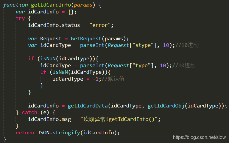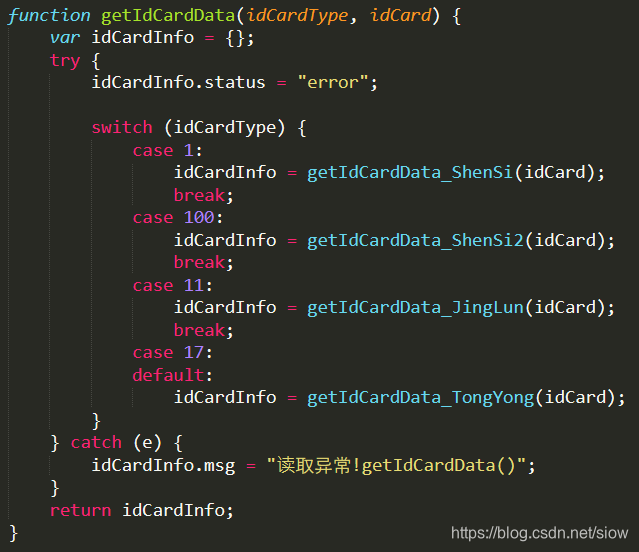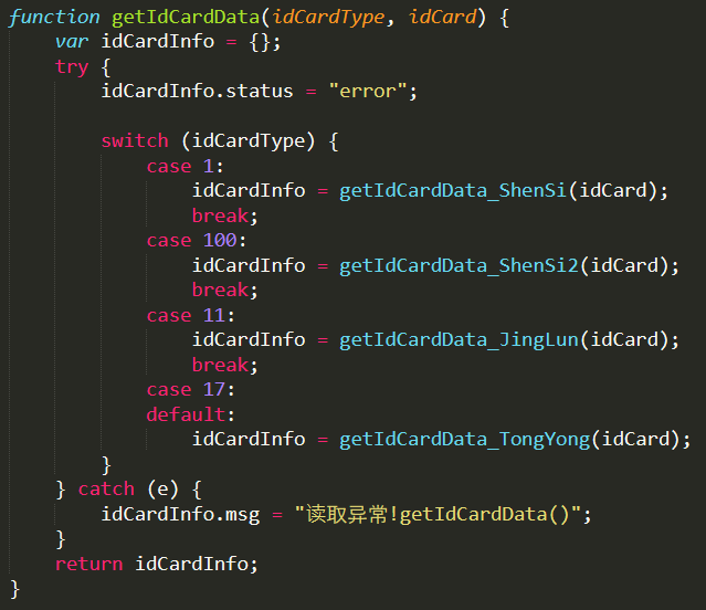 getIdCardInfo.js中有同名函数,调用,然后进行根据硬件类型的type参数,再调用getIdCardObj()和getIdCardData()进行硬件的访问和数据的包装,看代码: