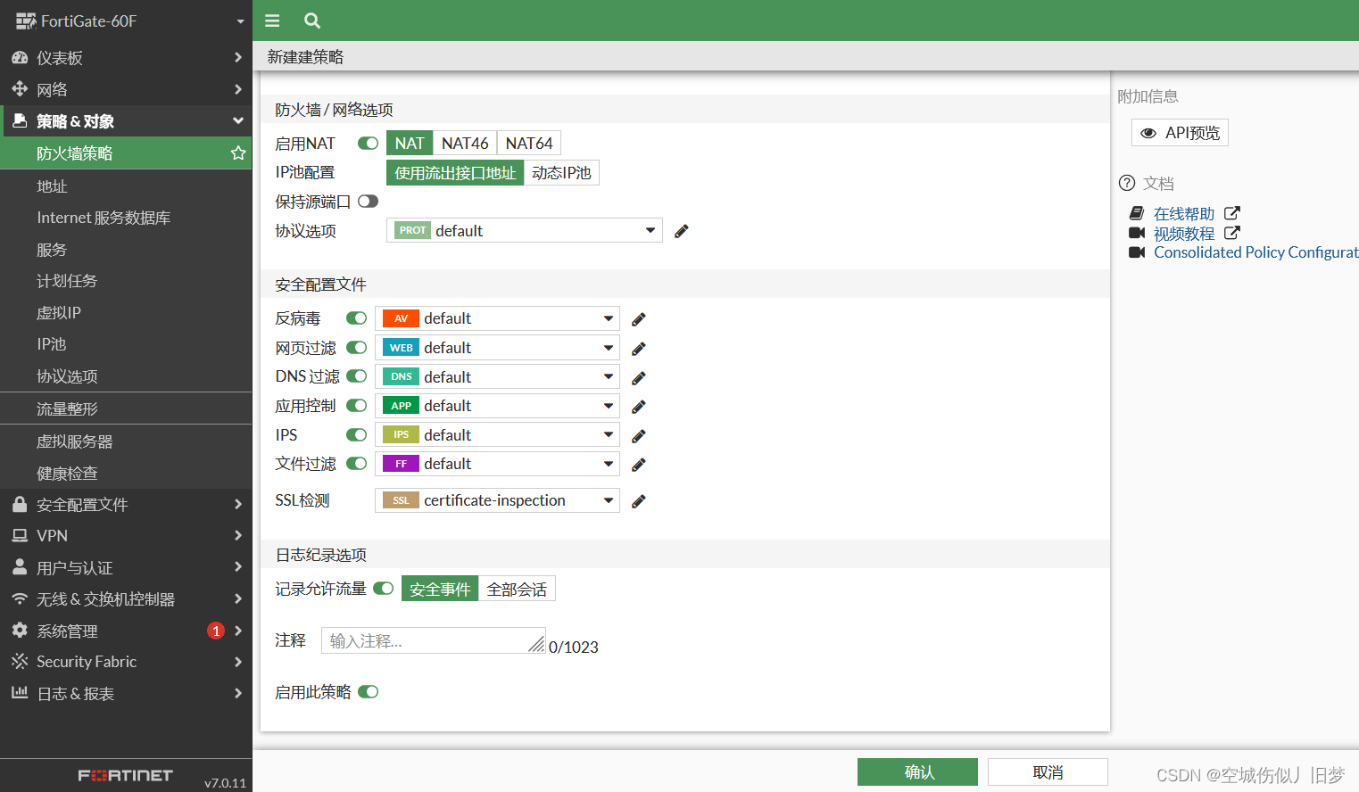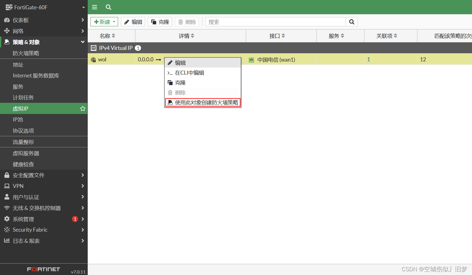 ②右键点击该策略,选择使用此对象创建防火墙策略,(图中流入接口为SD-WAN接口)并开启AV反病毒,IPS等UTM安全防护功能。