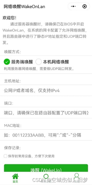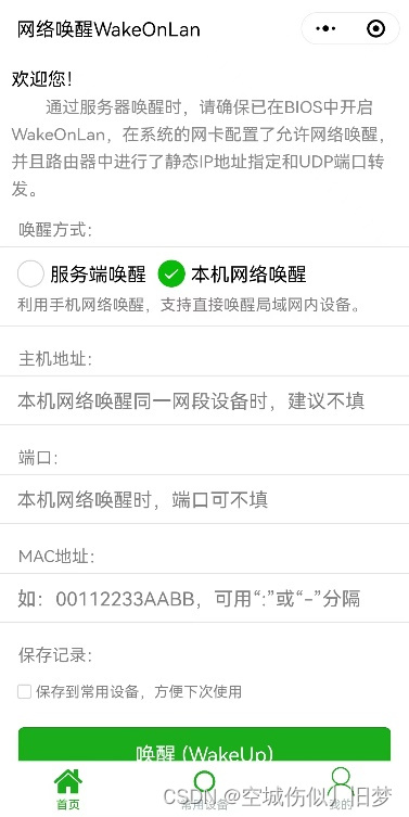 ②使用同局域网下的手机打开微信小程序网络唤醒WakeOnLan(本机网络唤醒)或者其他软件测试网络唤醒功能(默认情况下网络唤醒魔术包为端口号为9的UDP数据包)。