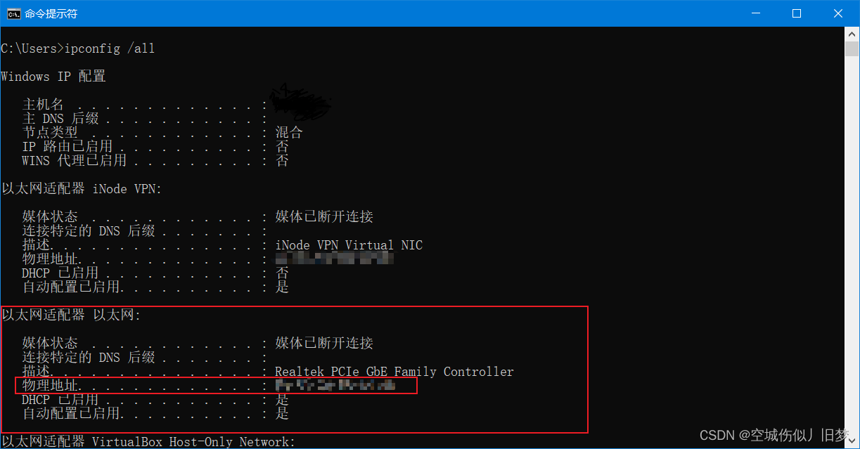 ①使用任务栏中搜索打开CMD命令行,输入ipconfig /all查看有线网卡MAC地址,并记录MAC地址值XX-XX-XX-XX-XX-XX。