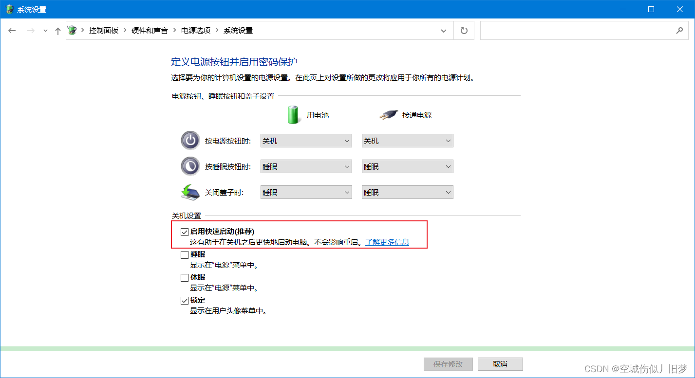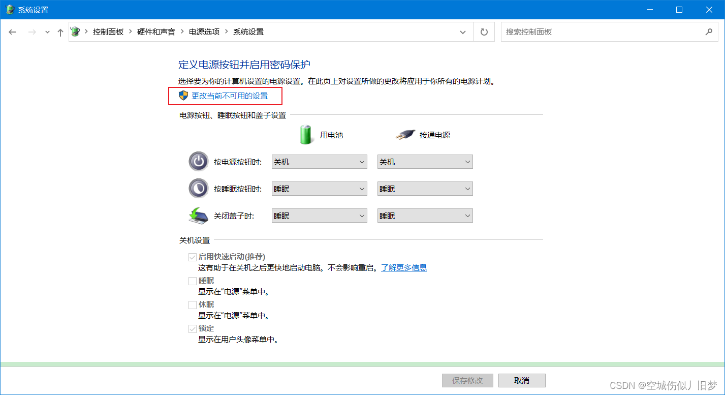 打开控制面板,依次点击电源选项,选择电源按钮的功能,更改当前不可用的设置,取消勾选启用快速启动(推荐)复选框。